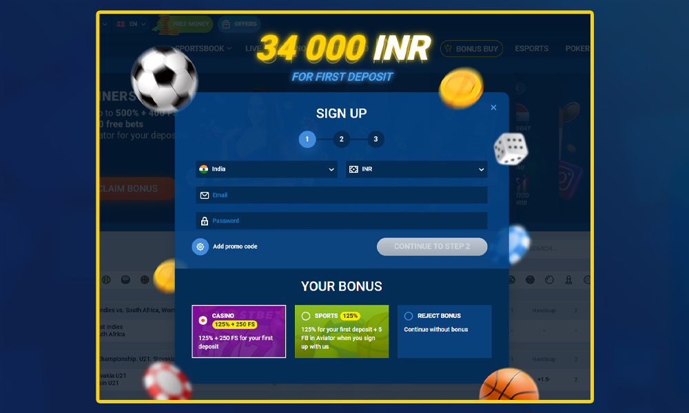 Immediately after registration you can get a welcome bonus. If you deposit money, you get a bonus on top. Everything is fair: if you deposit, for example, ₹3000, you get another 3000 rupees bonus. The main thing is to do it within 7 days of account creation.