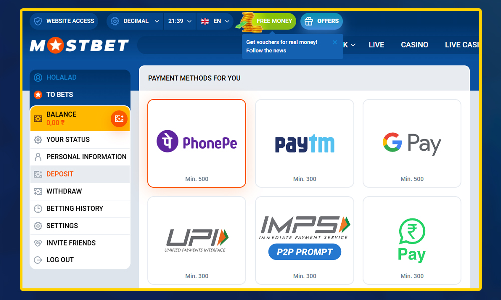 The minimum deposit amount is ₹300. Minimum withdrawal amount – from ₹1000 (the limit changes from time to time). Money comes quickly: sometimes in 5 minutes, sometimes you have to wait up to 2-3 days. Mostbet does not charge commission, but banks or crypto networks may take their share.